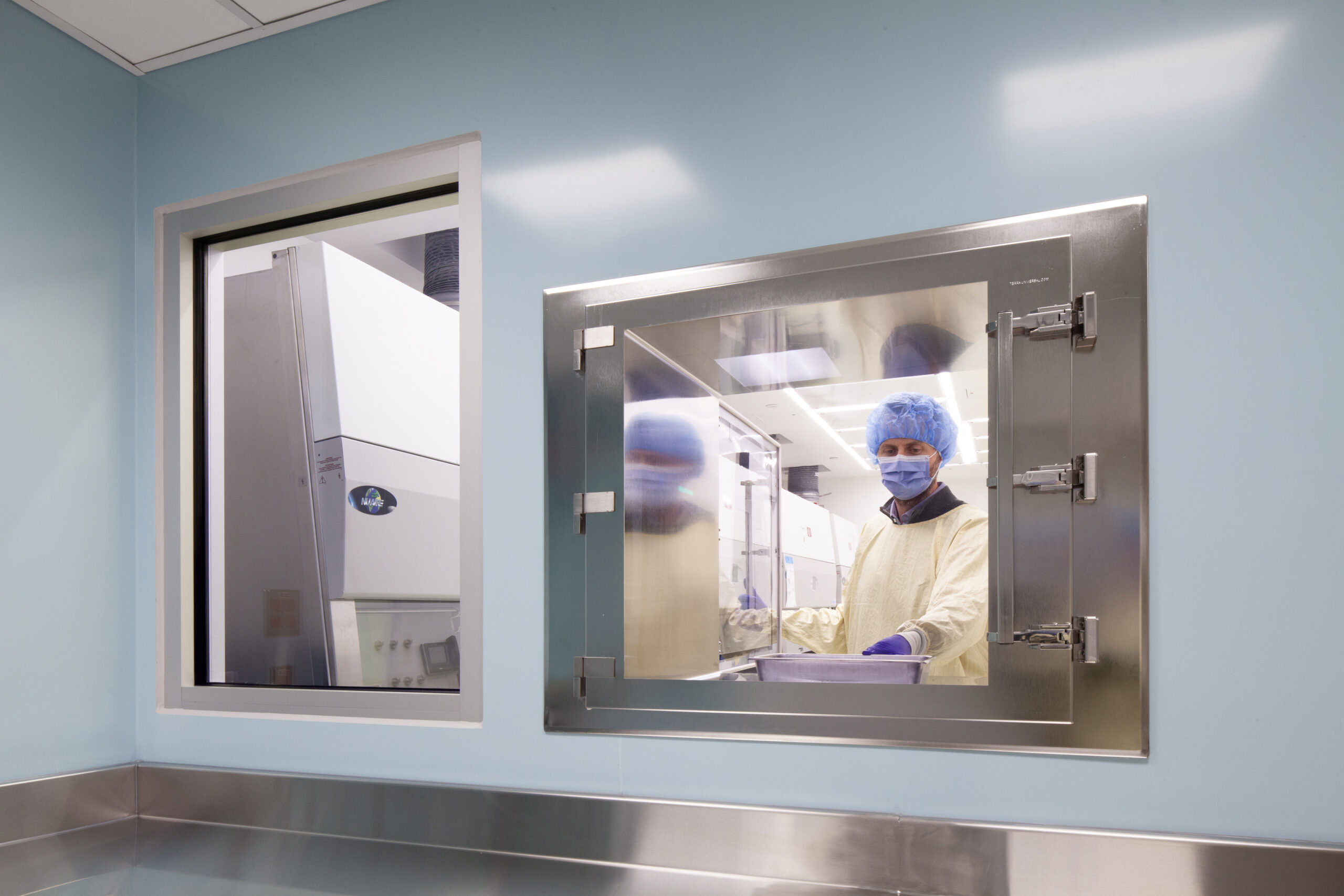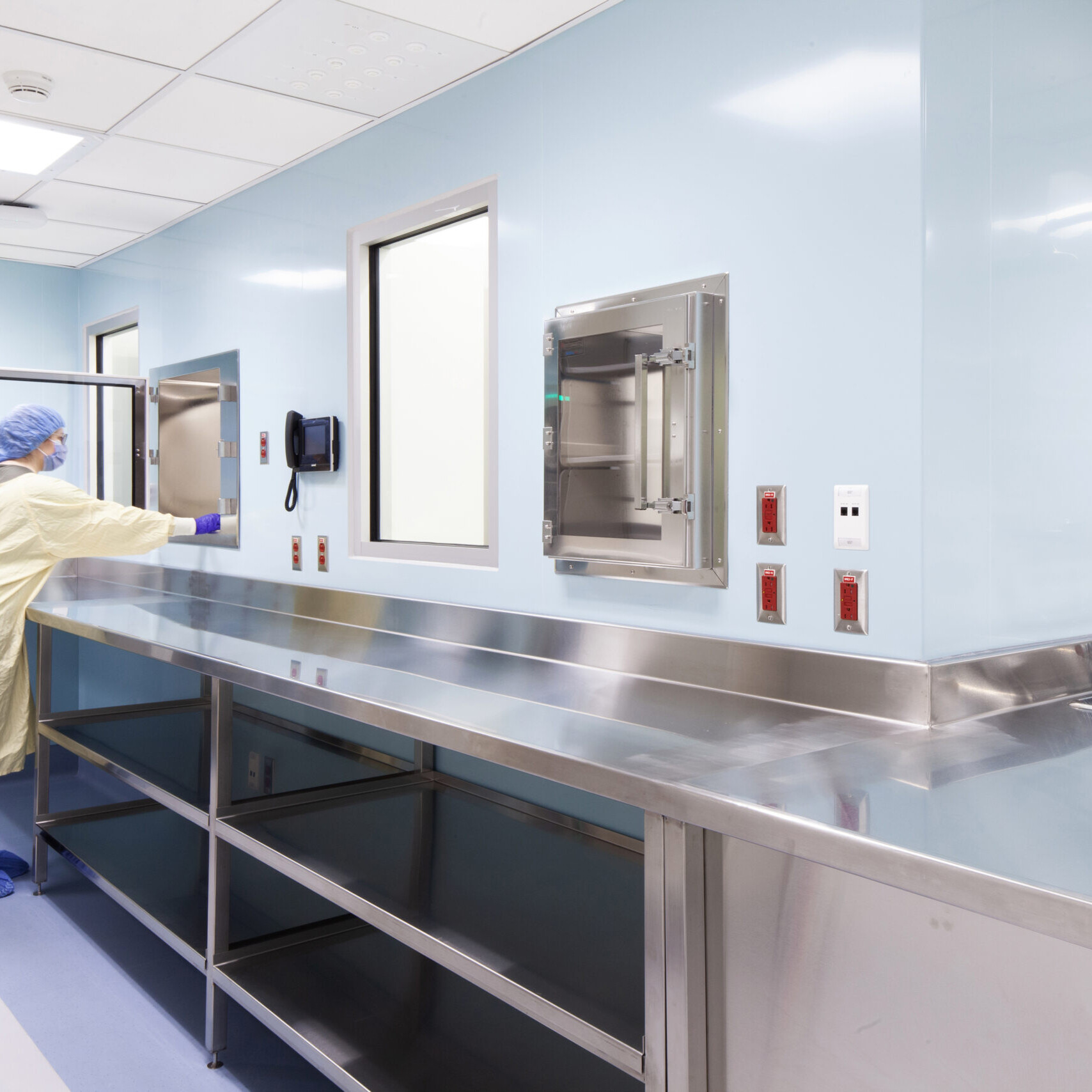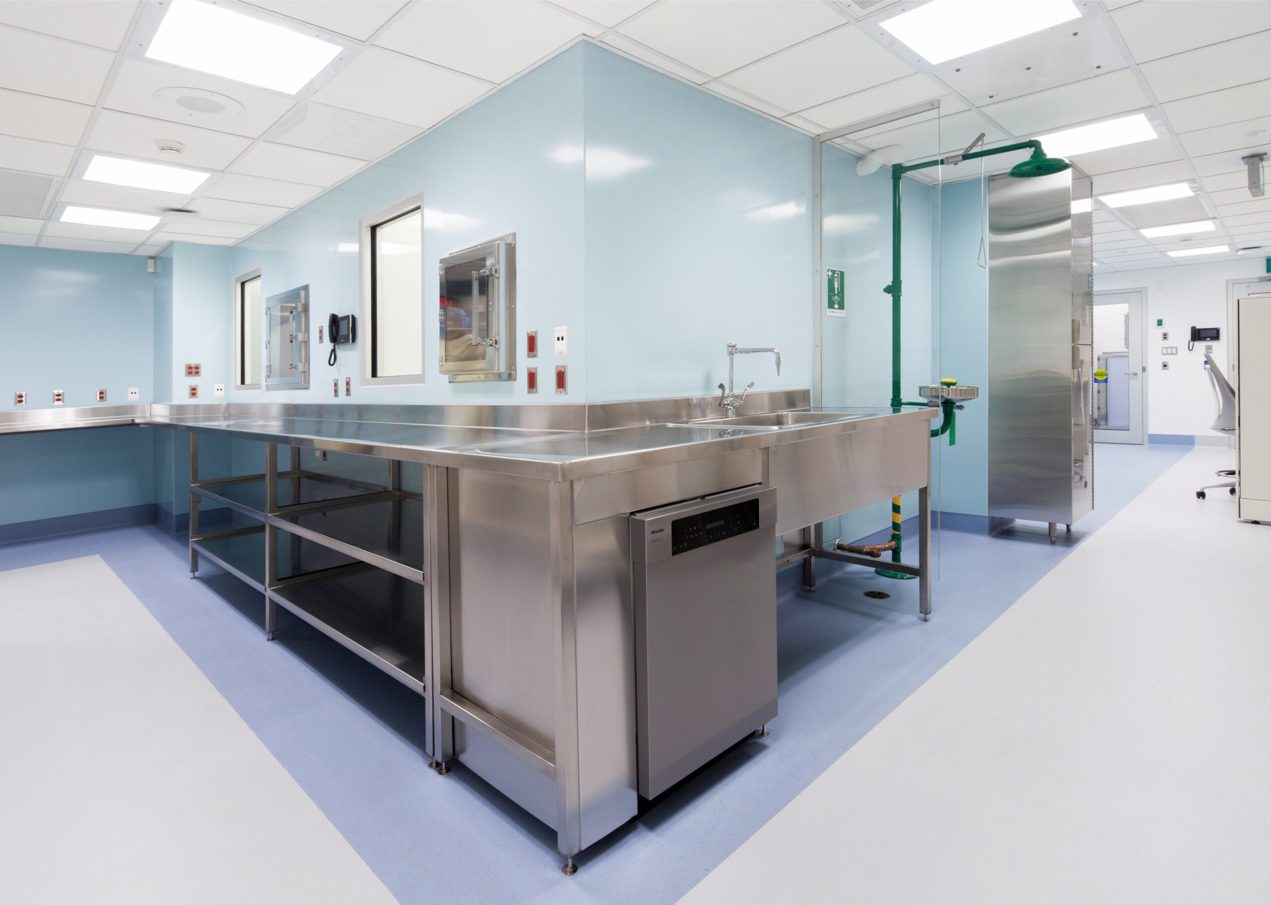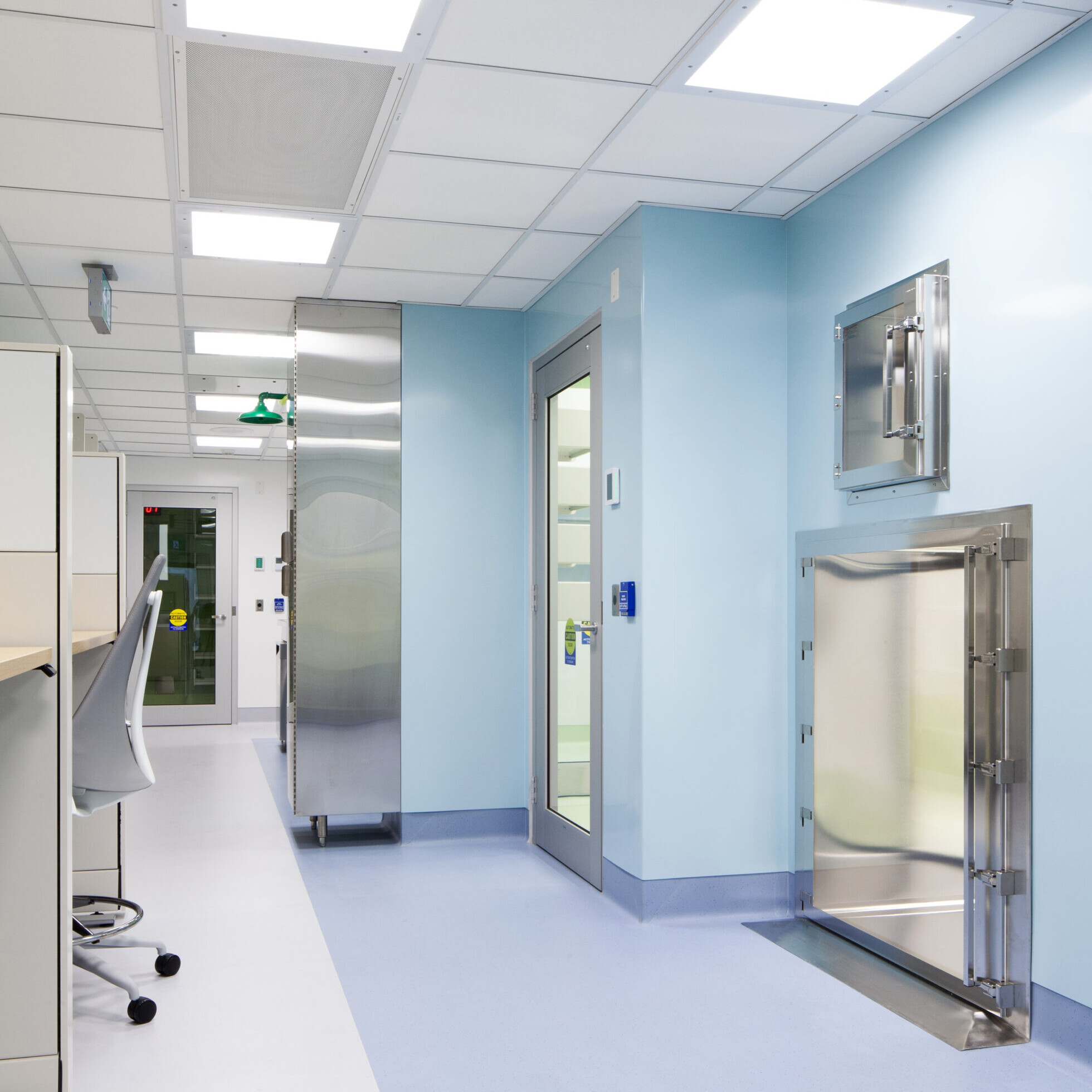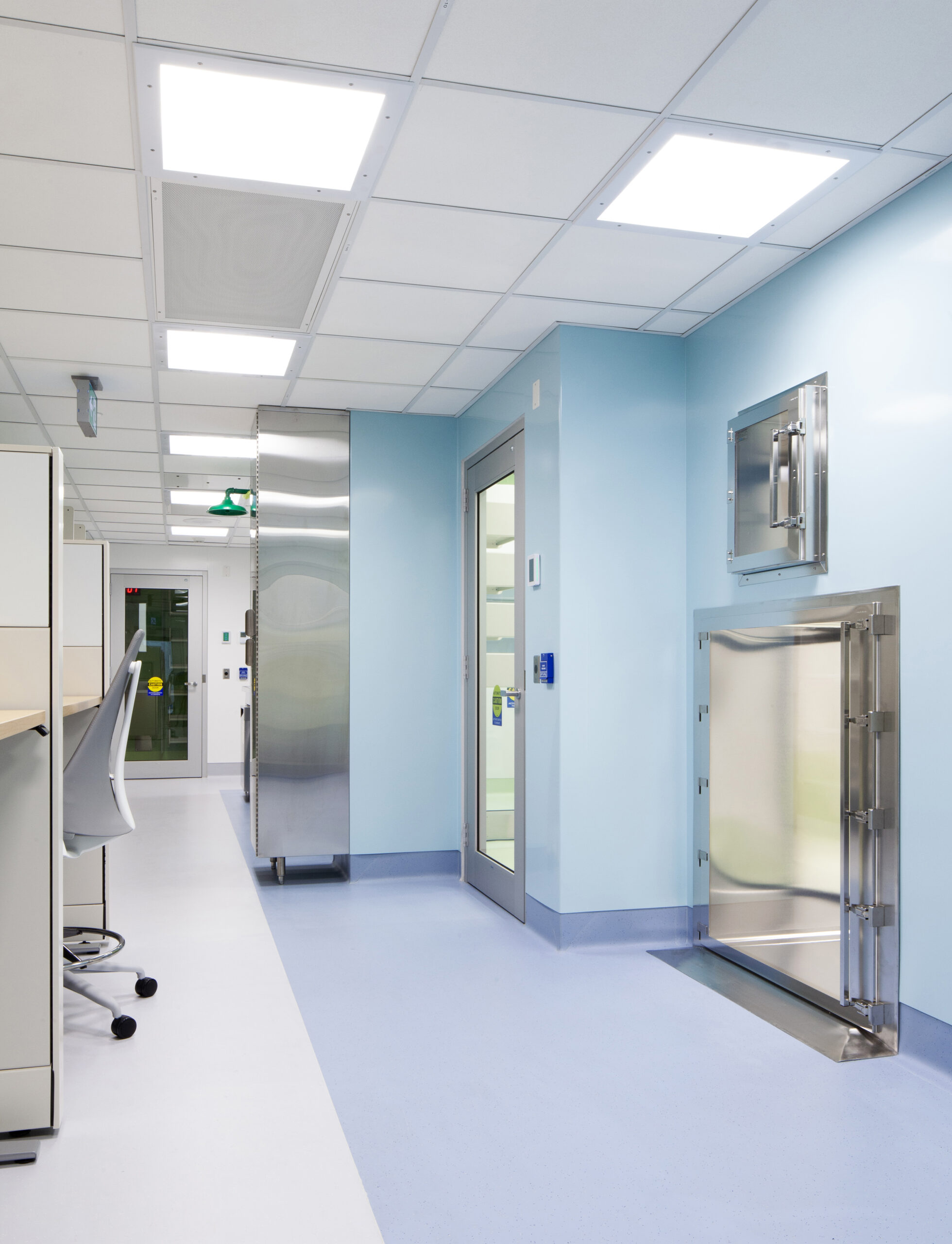 Beyond the technical improvements, KRA brought a human-centered approach to the design. The pharmacy’s interior uses a calming palette of light blues and greens to brighten the windowless environment and create a sense of ease. Stainless-steel work surfaces add a crisp, contemporary edge that speaks to the precision of the pharmacy’s work, balancing warmth with functionality.