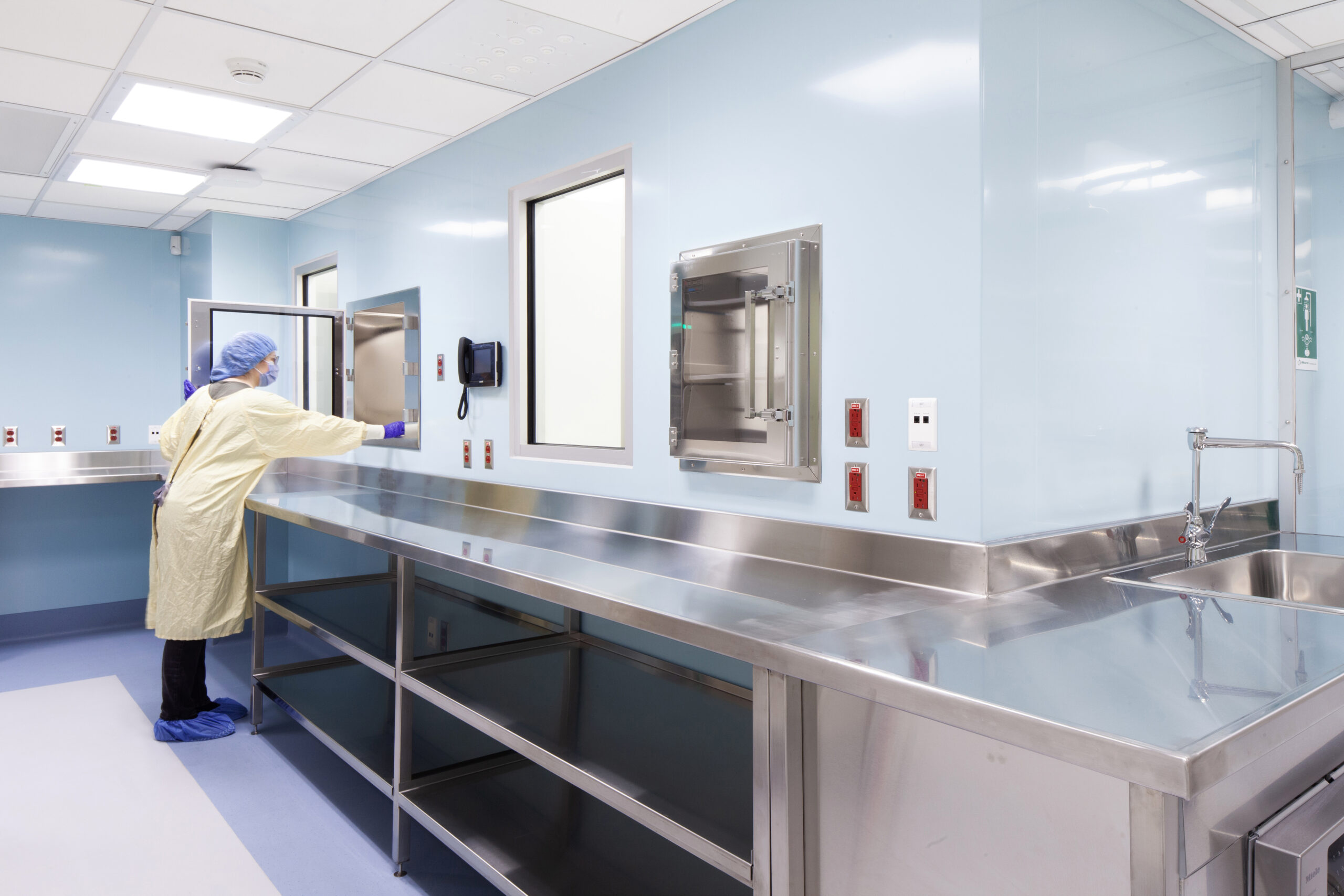 Beyond the technical improvements, KRA brought a human-centered approach to the design. The pharmacy’s interior uses a calming palette of light blues and greens to brighten the windowless environment and create a sense of ease. Stainless-steel work surfaces add a crisp, contemporary edge that speaks to the precision of the pharmacy’s work, balancing warmth with functionality.