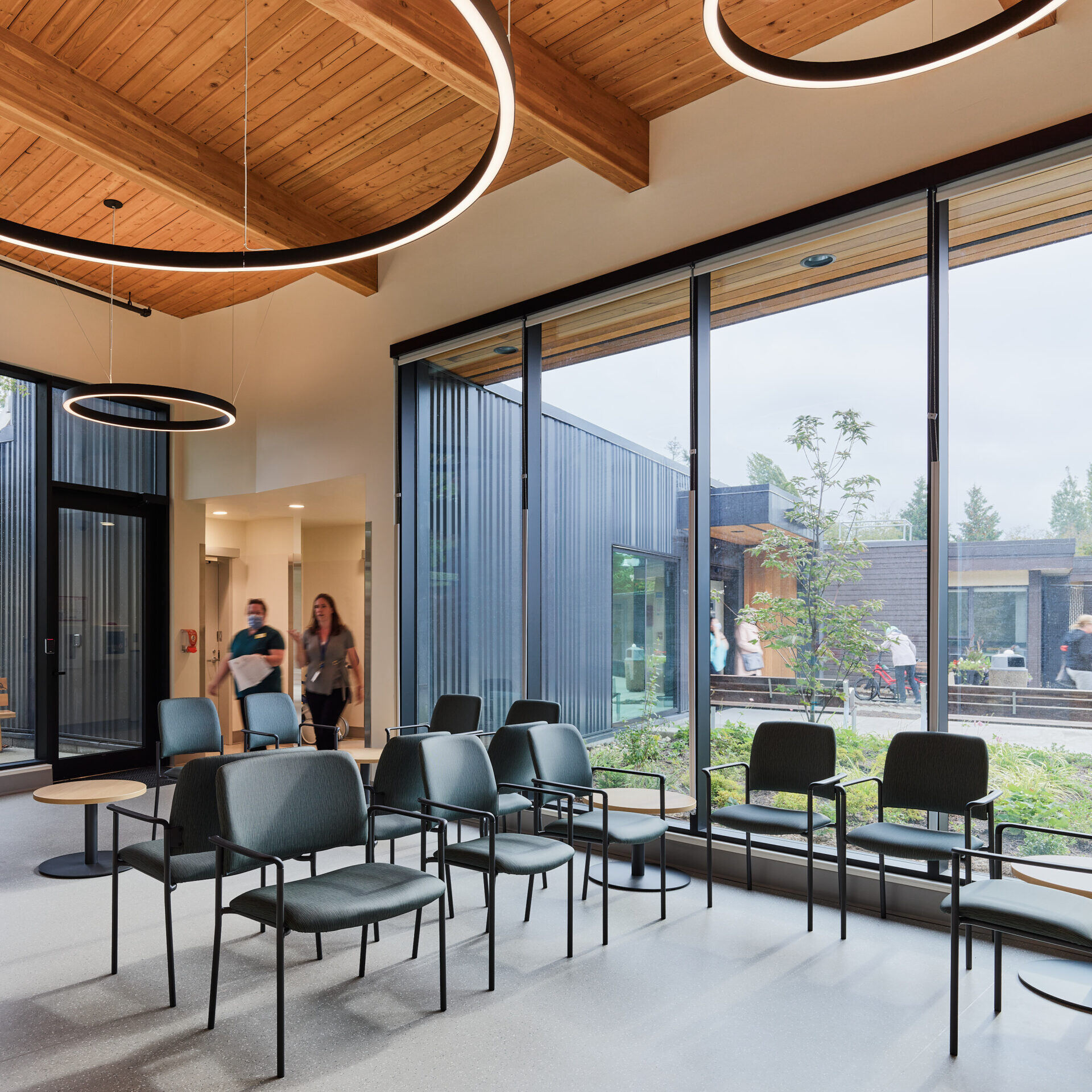 Our team’s design for the new addition utilized concrete slab on grade, with a wood structure above a flat roof with some of the equipment located at that level. Large windows and high ceilings (12′) in the waiting area bring in natural light and provide garden views, which creates an inviting and calming effect. The facade of the new addition is clad in industrial metal siding that compliments the design of the existing hospital. Although LEED accreditation was not pursued for this project, the objective was to follow LEED principles as closely as possible, including the selection of local materials, low VOC components and energy efficient building systems.