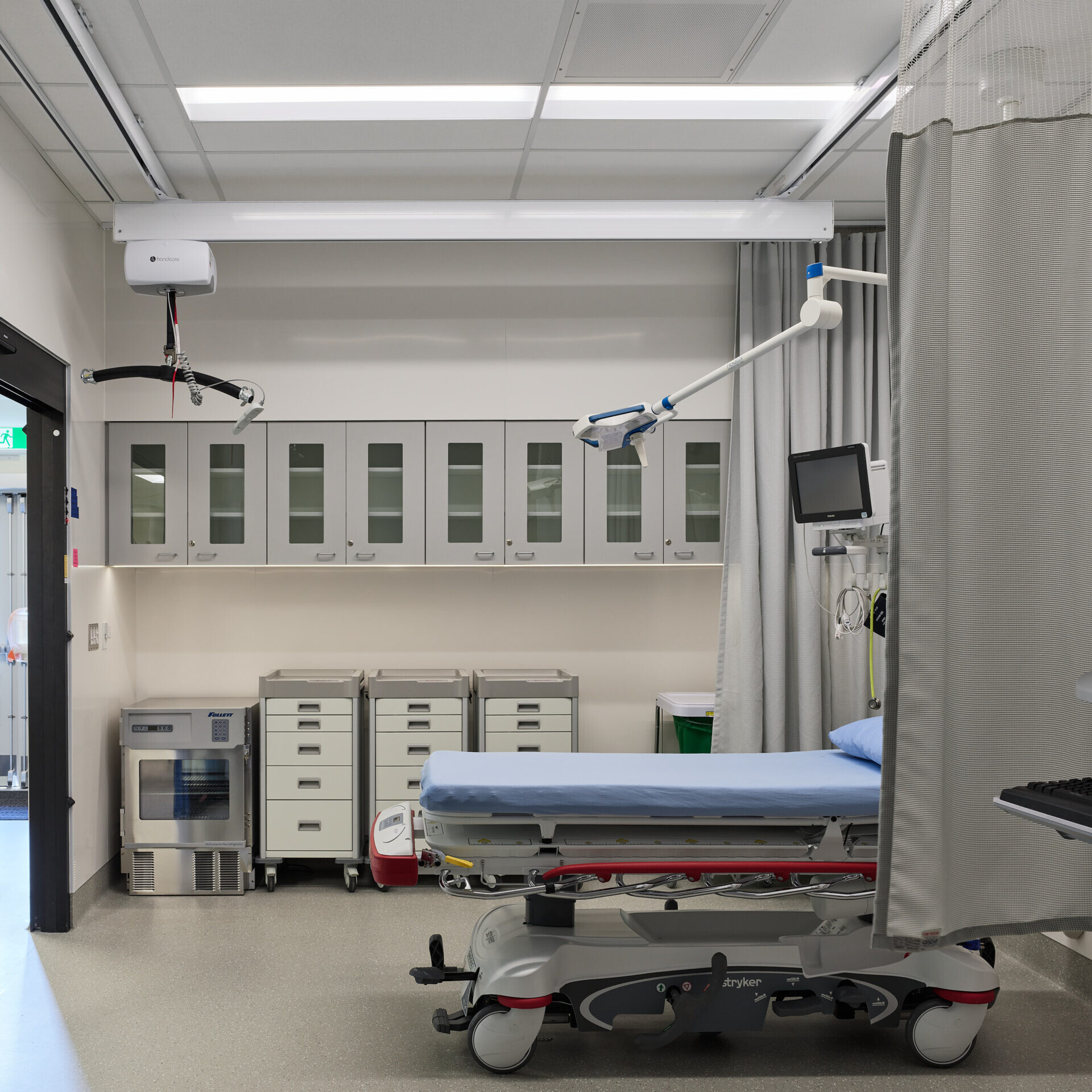 The expansion is adjacent to the main entrance and linked to the existing hospital via a new corridor that is directly accessible from the drop off area. The intent is to improve patient safety by providing direct access to the ER and a check in counter with quick access to the triage desk.