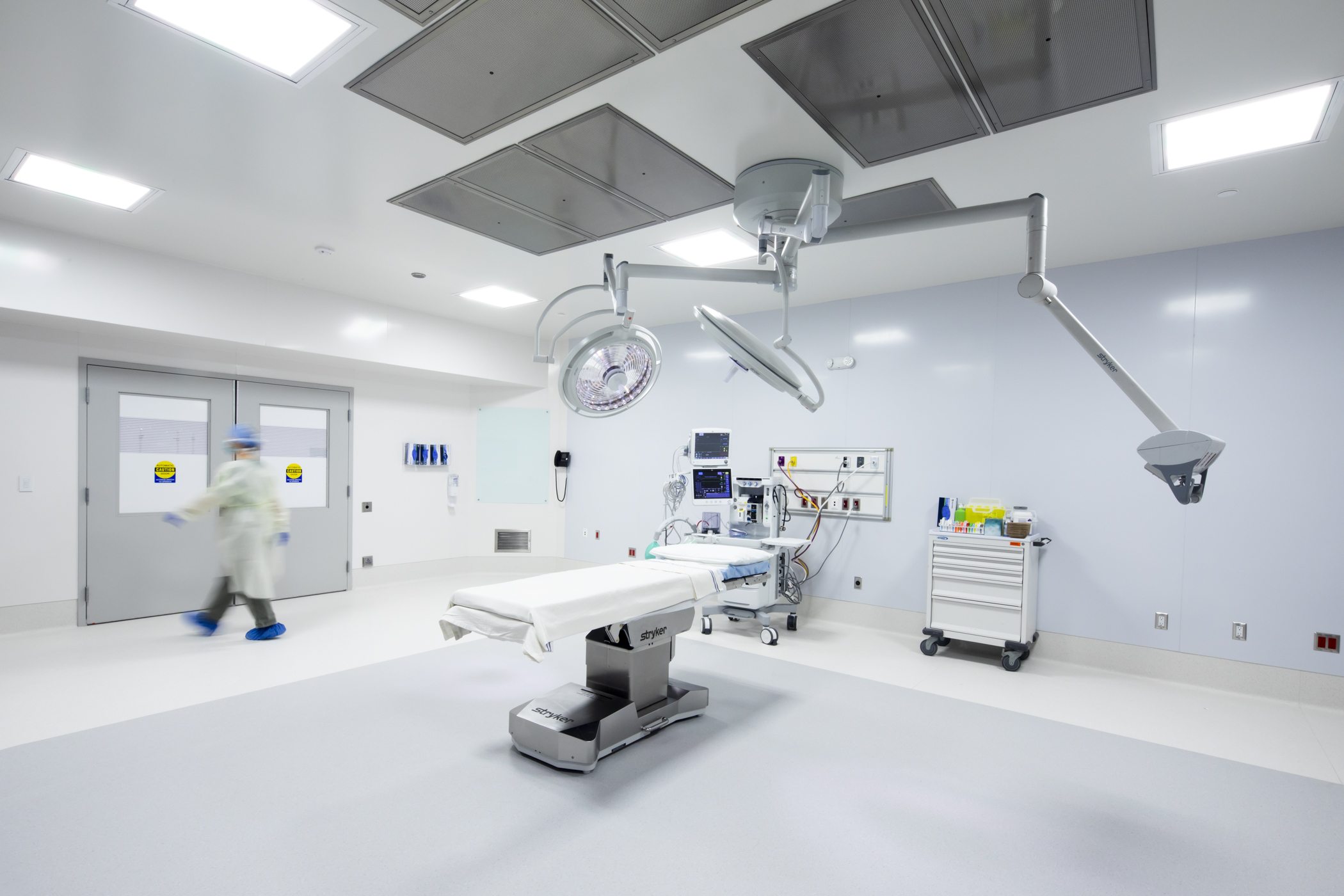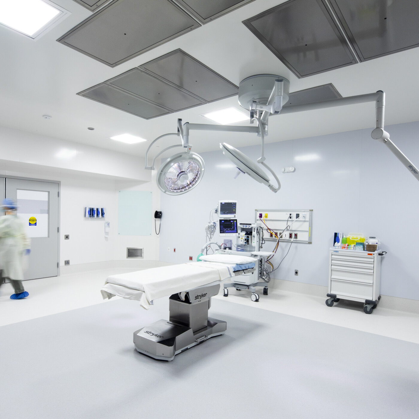 The operating suite is organized as a restricted zone with four operating rooms, each equipped to accommodate a broad range of procedures, including orthopedic, gynecological, ENT, general surgery, plastic surgery, and podiatric services.