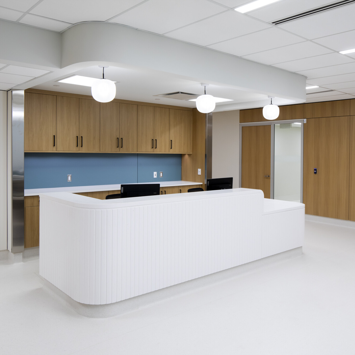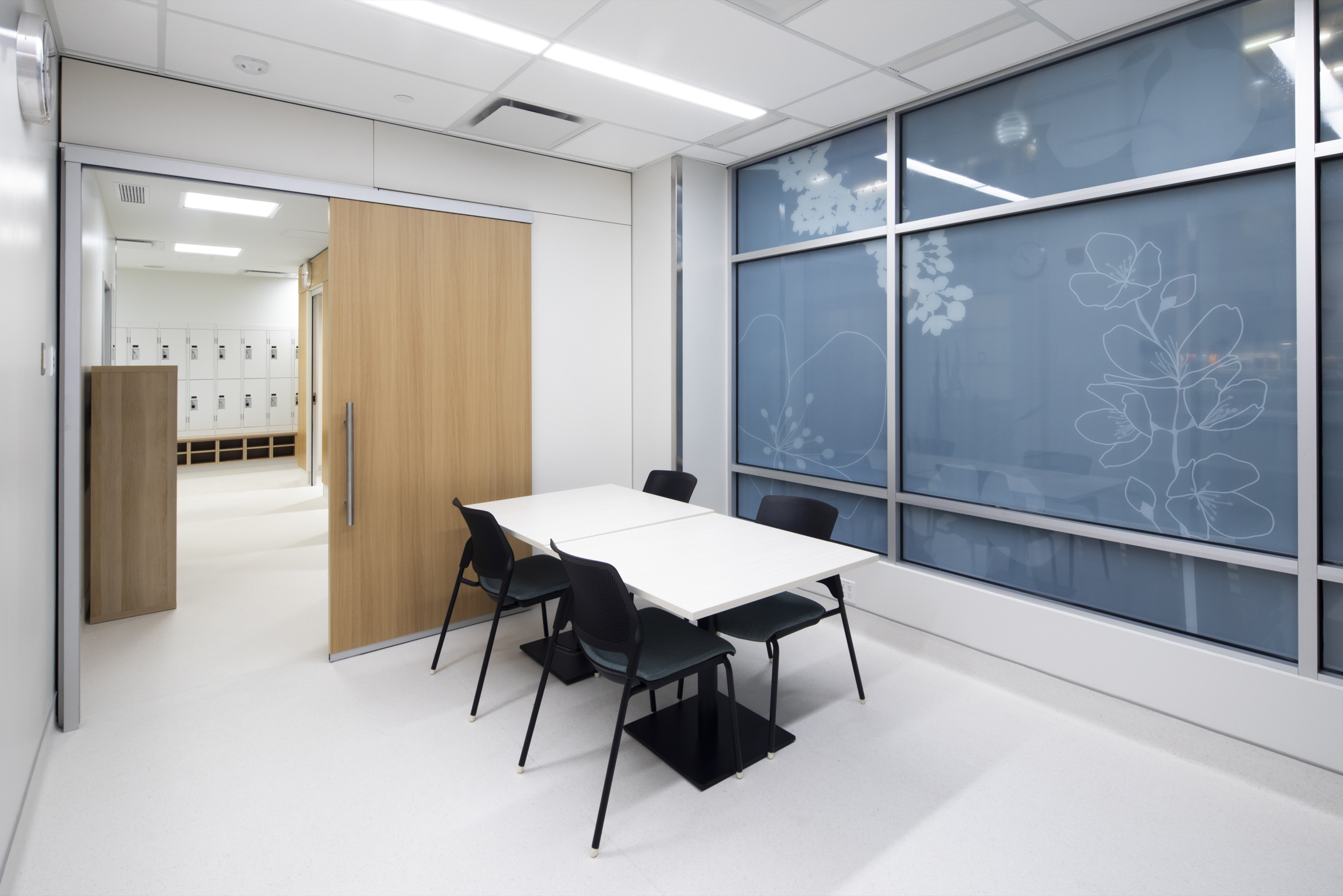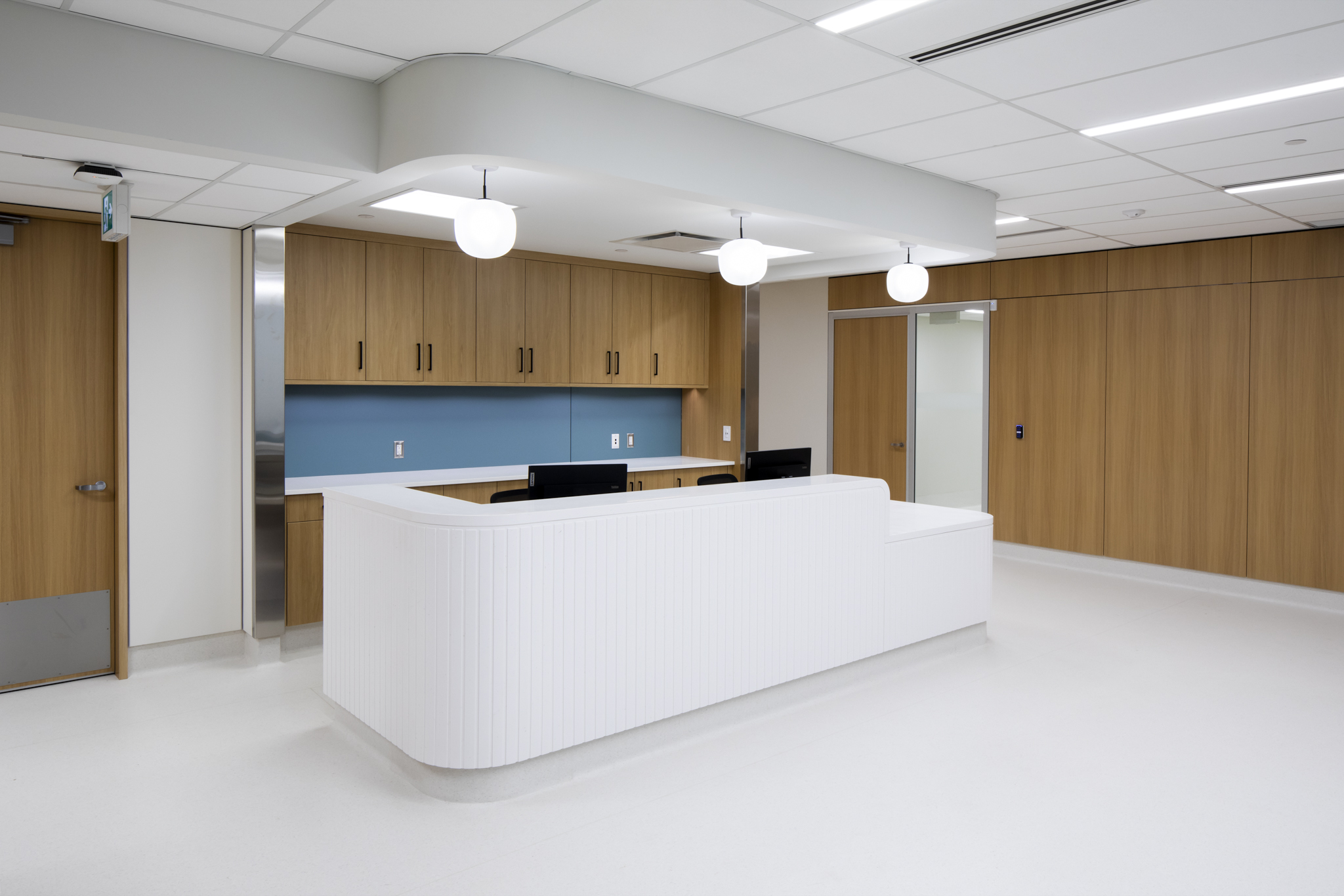 Interior design balances the stringent infection control requirements of a surgical facility with a calm, welcoming patient experience. Falkbuilt wall panels at reception introduce warmth while maintaining durability and cleanability, complemented by a rounded reception desk that enhances safety and softens the space. Glazing throughout the facility incorporates privacy film with an organic floral pattern in muted tones, allowing natural light to filter through while maintaining privacy from the commercial building lobby and exterior.