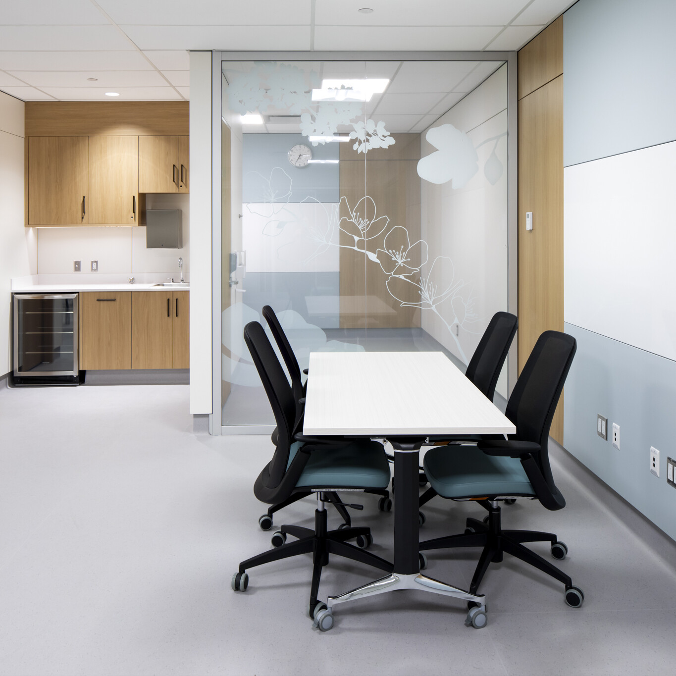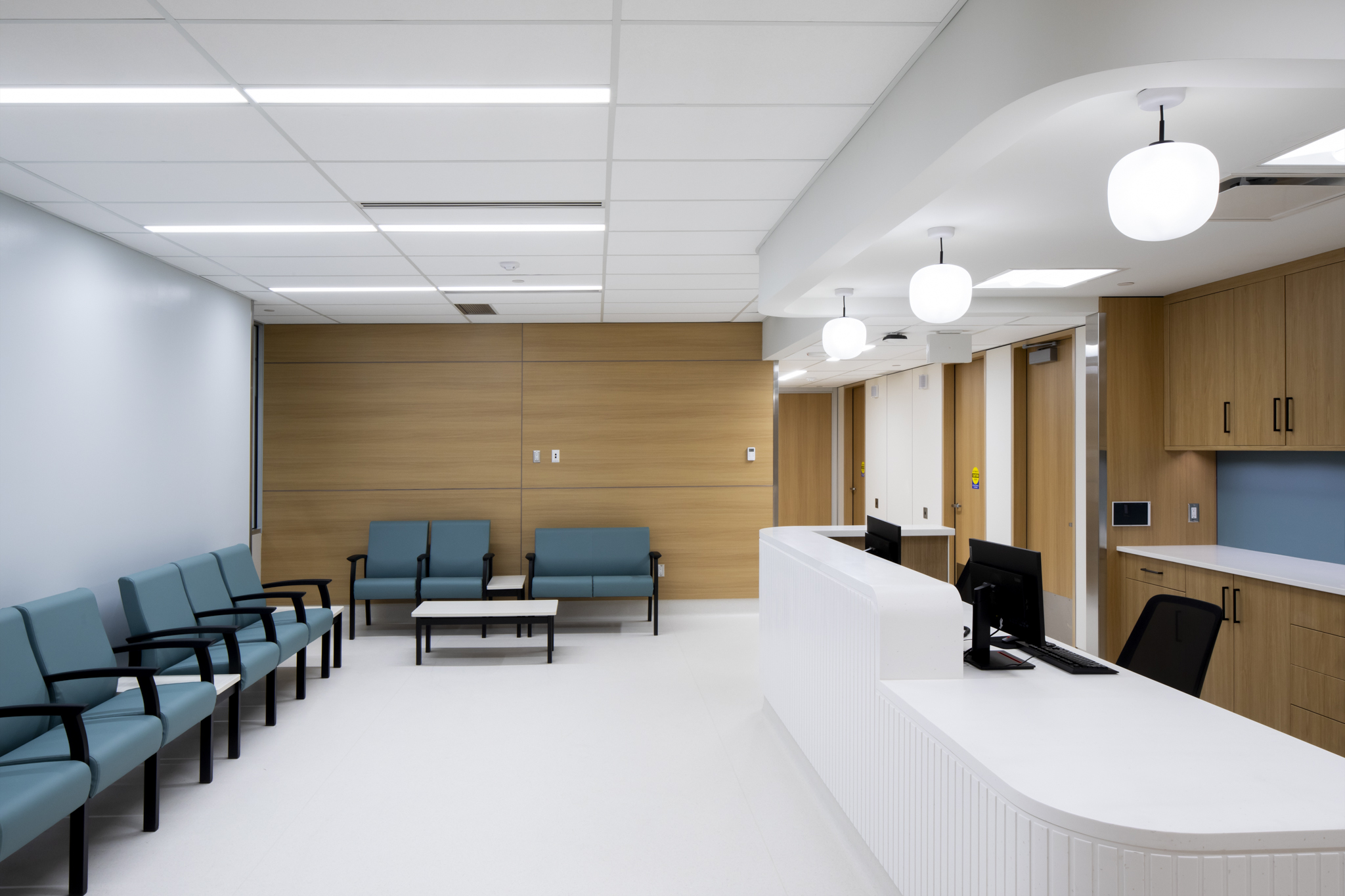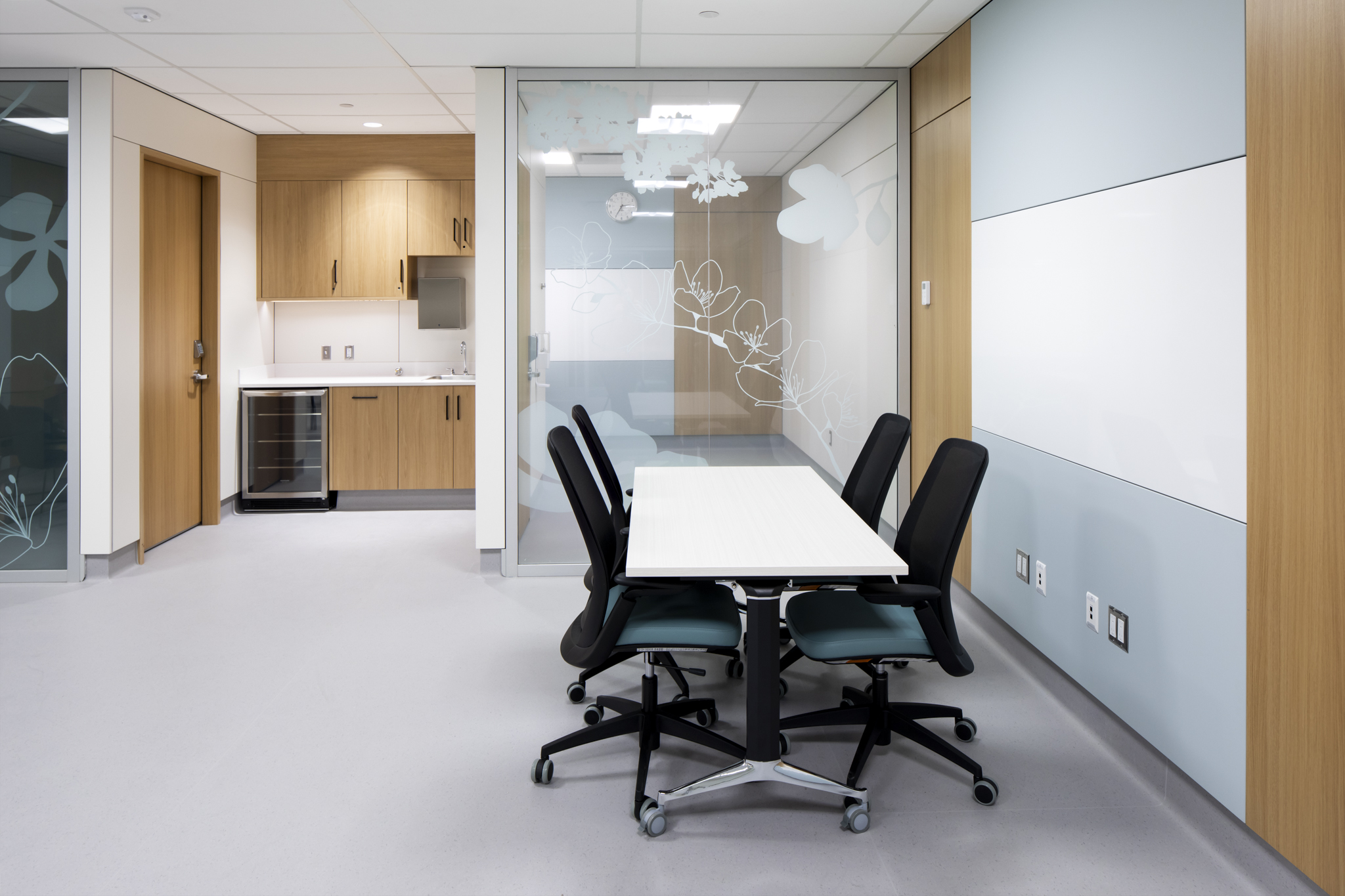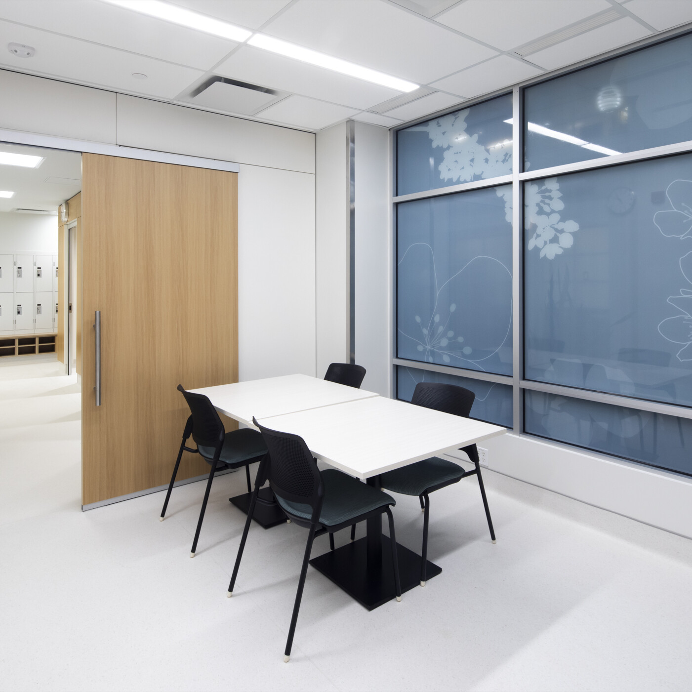 Interior design balances the stringent infection control requirements of a surgical facility with a calm, welcoming patient experience. Falkbuilt wall panels at reception introduce warmth while maintaining durability and cleanability, complemented by a rounded reception desk that enhances safety and softens the space. Glazing throughout the facility incorporates privacy film with an organic floral pattern in muted tones, allowing natural light to filter through while maintaining privacy from the commercial building lobby and exterior.