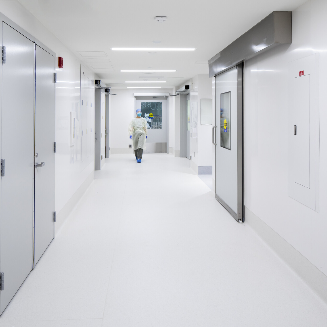 The Post‑Anesthesia Care Unit (PACU), located within a semi‑restricted zone, includes recovery bays, support spaces, and four patient changing rooms to streamline pre‑ and post‑operative care. A soft, restrained colour palette supports patient comfort and helps reduce stress during post‑operative recovery.